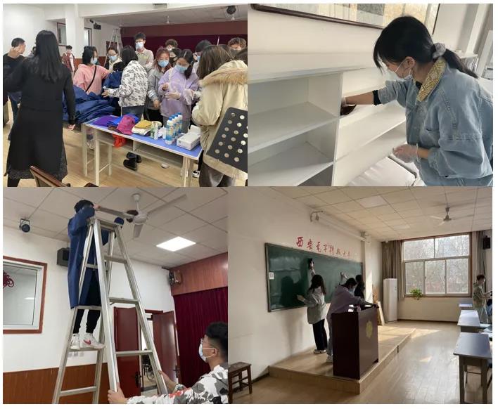 在刘国义老师的指导和安排下,志愿者们纷纷拿起工具,按照分工迅速投入到热火朝天的劳动中。男生们主动承担了清理空调、擦电扇、拖地、倒垃圾等重活累活,女生有的擦桌子,有的擦玻璃,一个个都忙的不亦乐乎。