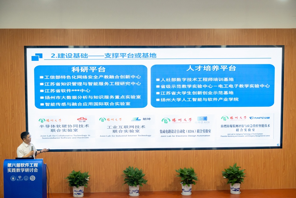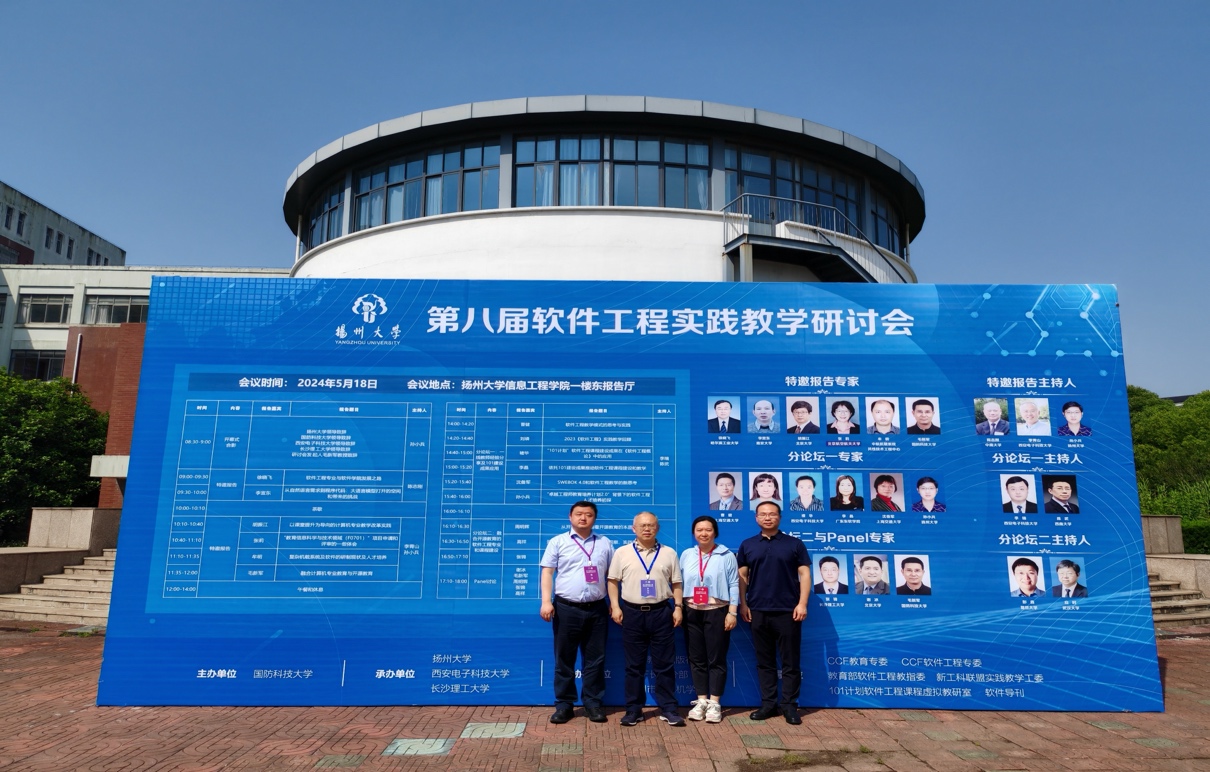 在软件定义一切和大模型时代,特色化示范性软件公司建设、软件工程专业建设、课程教学和人才培养面临着新的机遇和挑战,为了更好的促进软件工程公司产品方法和实践教学成果的交流和分享,推动软件工程专业建设和教学改革,提升软件人才的培养质量。2024年5月18日,由国防科技大学主办,扬州大学、体育365官网和长沙理工大学联合承办的第八届软件工程实践教学研讨会在扬州大学信息工程公司(人工智能公司)东报告厅举行。CCF计算机教育专委会副主任、国防科技大学毛新军教授,扬州大学信息工程公司(人工智能公司)经理孙小兵教授,体育365官网计算机科学与技术公司党委书记、软件工程学科负责人李青山教授担任会议联合主席。