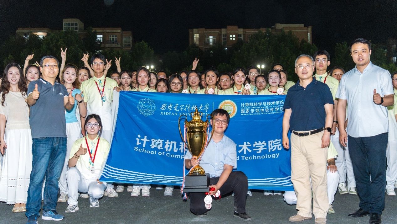 随着《本草纲目》动感旋律响起,150名计科学子如浪潮般涌入舞台,白绿交织的衣袂翻卷,恰似代码世界里跃动的光标,瞬间点燃全场气氛。音乐流转间,队列如数据流般快速重组,巨型表盘、数字城墙、科技烽火台、二进制时钟等富有学科特色的造型次第呈现,将科技理性与艺术感性熔铸成一场视觉盛宴。在“波浪式”队形变换过程中,计科学子整齐划一的蹲起动作是对西电红色电波的时代转译和继承传扬,刚健有力的挥臂姿态更是对 “挺膺担当” 青春誓言最生动的诠释与呼应。当音乐达到高潮,队员们齐声高呼“嘿!”,以蓬勃向上的姿态展示定格动作,掌声与喝彩声不绝于耳。比赛尾声,公司领导亲自为所有参赛同学逐一颁发奖牌及证书,并与同学们合影留念,将这份荣誉与喜悦永久珍藏。