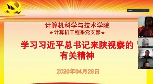 (通讯员 杨鹏飞)4月20日至23日,习近平总书记来到陕西考察。他深入自然保护区、贫困山区、社区、公司、企业等,了解秦岭生态环境保护、脱贫攻坚、复工复产等情况,就统筹推进新冠肺炎疫情防控和经济社会发展工作、打赢脱贫攻坚战进行调研,看望慰问干部群众。为深入学习领会习近平总书记视察期间的重要讲话精神,体育365官网计算机工程系党支部于4月29日晚召开支部专题学习会,会议由支部书记鱼亮主持。