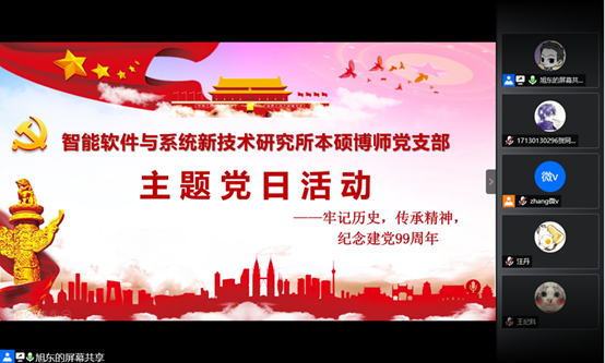 (通讯员 贺同庆)为庆祝建党99周年,重温党的光辉历史,传承弘扬革命先辈的奋斗精神,体育365官网智能软件与系统新技术研究所本硕博师联合党支部于2020年7月1日召开了“牢记历史,传承精神——庆祝建党99周年”主题党日活动。本次活动由支部青年委员王旭东同志主持,活动共计39人参加,采用腾讯会议线上召开的方式进行。