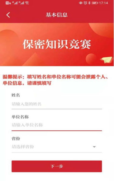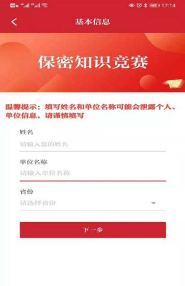 2.点击考试栏目,进入考试界面,填写“姓名”“单位名称”,选择“省份”,点击“下一步”开始考试。(姓名可填昵称,单位名称请填写:体育365官网)。
