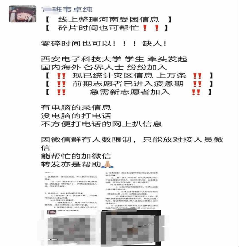我分管了志愿者的招募和工作分流,那时我们的微信群聊已经有七个,我们逐步优化出一个较完善的工作流程。由我的微信作为志愿者引入窗口将志愿者拉到分流群,我搭建起一个分流指引工作班子,由分流人员将志愿者指引到五个不同的工作组,而我同时也是五个工作群的管理员,我需实时监控着各个工作组的进度并做出对应调整。我必须把整个信息的整理工作的秩序牢牢抓住,才能让团队其他负责人全心地对接线下救援队。我刷屏了西电的各个群聊,也将招募信息发到中学时期的各个班群,恳求同学们将信息发至各自到高校,因为我在西电里发再多,也只是西电的员工。不同高校的人,一个人转发了就可能引流来一个高校的志愿者。动员各大高校是真实有效的,那时我们的志愿者发展到了2000人。