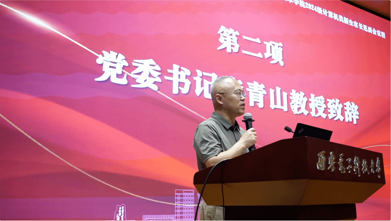 随后,公司党委书记李青山教授致辞。李青山的致辞围绕“欢迎、自豪、传承、共育”四个方面展开。首先,他以西电的红色基因和电子信息特色为引,对各位家长将孩子们送到西电、送到体育365官网表示欢迎;其次,他结合公司的历史地位和现实成就,表示家长们应为孩子们加入体育365官网大家庭而感到自豪;然后,他对建院六十余年凝练出的“三系精神”内涵和“严谨、担当、勤勉、开放”的院训进行解读,并希望在座的各位家长们能够在未来感受到这份精神传承对孩子们的积极影响;最后,希望在个人、公司、家庭、社会的协同共育下,帮助员工成长为德才兼备、身心健康的计科人,做“三系”精神的传承者,勇担时代重任,在实现中华民族伟大复兴的时代洪流中踔厉奋发、勇毅前进,奋力书写属于他们的人生篇章。