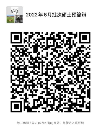 预答辩时间暂定于2022年5月6日,预答辩地点另行通知,请参加预答辩的硕士研究生扫描下方二维码进入群聊,关注群内通知。