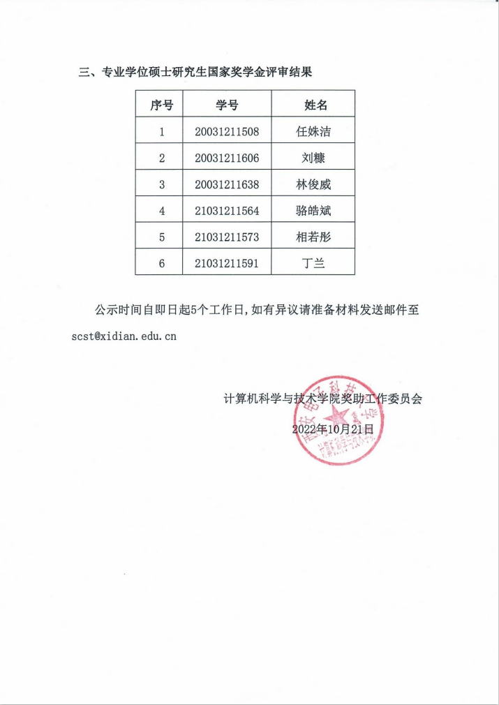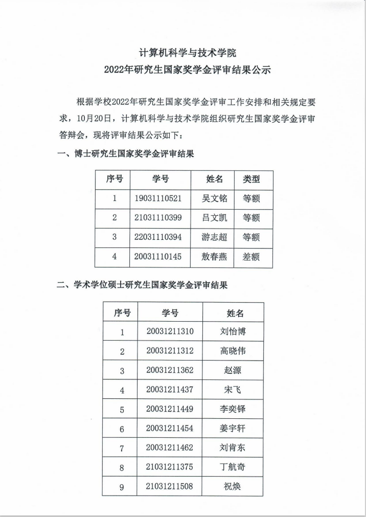 2022年研究生国家奖学金评审结果公示