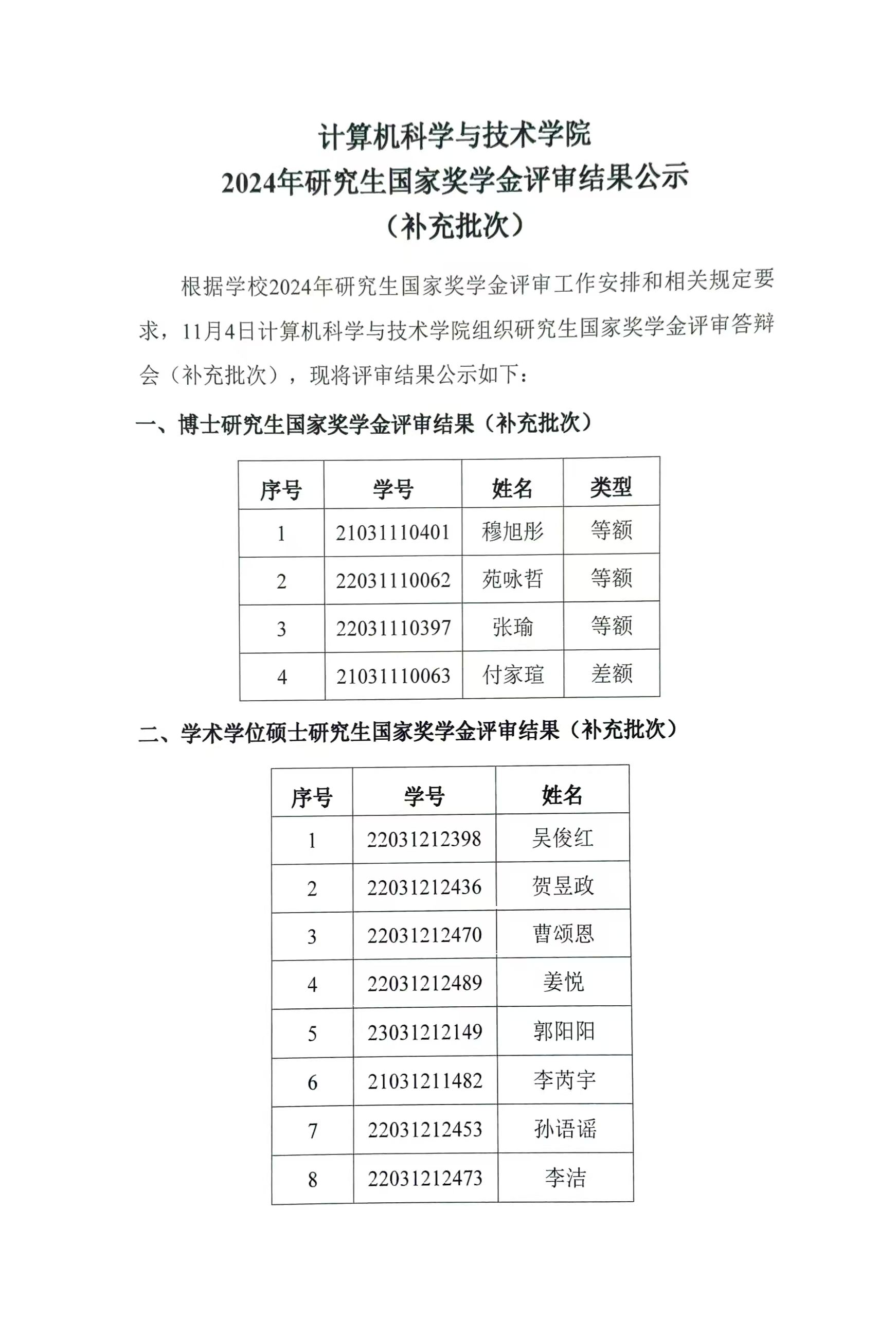 2024年研究生国家奖学金评审结果公示(补充批次)