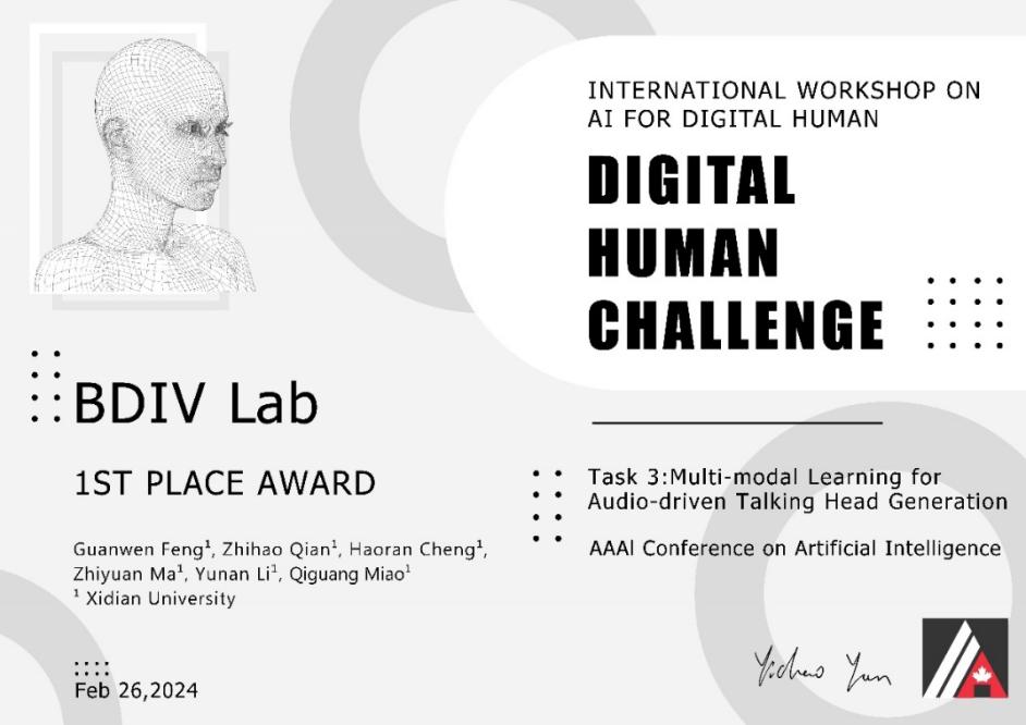 (通讯员 李宇楠)3月13日,2024年国际人工智能顶级会议AAAI竞赛奖项正式颁布,来自体育365官网大数据与视觉智能研究所博士研究生冯冠文、本科生钱之浩、硕士研究生程昊然、麻志远组成的BDIV Lab团队在苗启广和李宇楠两位老师的共同指导下,从中国科学技术大学、华南理工大学、中国平安科技、上海学深智能科技、VAST等海内外十多家单位的参赛队伍中脱颖而出,在AAAI2024 Workshop AI for Digital Human的任务3:Multi-modal Learning for Audio-driven Talking Head Generation夺冠。