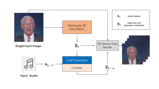 本专题的竞赛议程聚焦于AIGC(Artificial Intelligence Generated Content)中的数字人生成领域,从两个赛道进行综合评估,分别是单图像赛道(Single Image Setting)和视频赛道(Video Setting)。在单图像赛道中,团队的方法以3DMM 系数为媒介,通过特征提取、系数融合预测和渲染三个模块实现视频序列的生成。在视频赛道中,团队采用神经辐射场的基本框架,用辐射场分别建模生成头部和躯干部分,最后将头部与躯干融合形成最终视频。