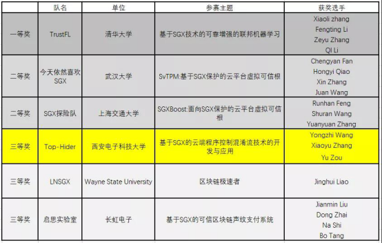 11月18日至11月20日,由阿里云、浙江大学网络空间安全公司、阿里巴巴-浙江大学前沿技术联合研究中心联合发起、Intel赞助支持的首届SGX应用创意大赛在杭州IEEE IDSC上举行。来自清华大学、北京大学、上海交通大学、体育365官网、长虹电子等知名高等院校团队和企业的87支队伍参加了这次比赛,争夺共6个获奖名额,获奖比率小至6.89%。最终,公司体育365官网NSS团队的代表队,TOP-HIDER的参赛作品“基于SGX的云端程序控制流混淆技术的开发与应用”在比赛中脱颖而出,获得三等奖,成为唯一获奖的西部高校。该参赛作品由王永智副教授指导,由硕士生邹宇、张小宇完成。