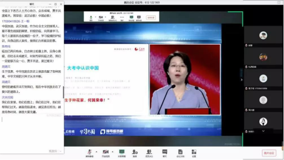本科2017级计算机科学与技术专业17030108班班长史越超通过腾讯课堂组织了主题班会,全班62名同学在线上的“云”相聚,共同观看思政课。在班长的组织下,同学们结合课程学习内容对党中央关于疫情防控的决策部署、身边防疫抗疫一线的感人故事等展开了讨论。班长史越超表示:“通过本次班会学习,同学们明确了作为老员工在这场疫情中的责任与担当,表示要身体力行,积极参与到防疫抗疫中,相信在不久后我们一定能取得战斗的胜利!”