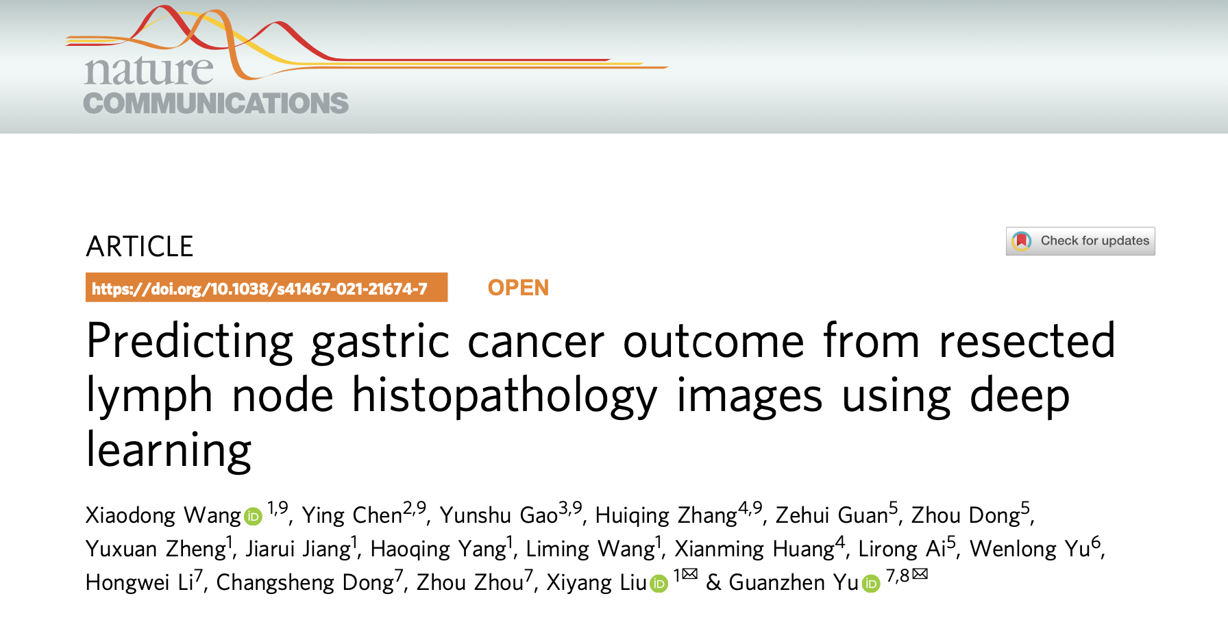 (通讯员 王晓东)公司体育365官网软件工程研究所刘西洋教授团队,在公司“软件工程”团队建设支持下,与上海龙华医院于观贞教授、长海医院陈颖教授等团队合作,开展了胃癌淋巴结转移预后预测的AI研究,历时三年,近期以西电第一作者单位在Nature Communications (IF=12.1)发表成果“Predicting gastric cancer outcome from resected lymph node histopathology images using deep learning”,研发了针对胃癌淋巴结病理临床诊断与精准亚分期的AI系统。