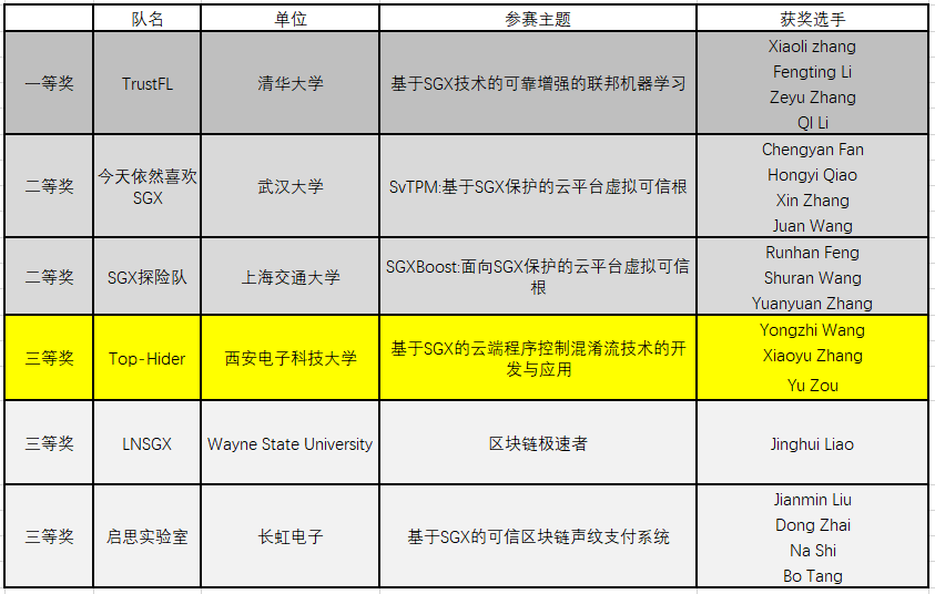 (通讯员 邹宇)11月18日至11月20日,由阿里云、浙江大学网络空间安全公司、阿里巴巴-浙江大学前沿技术联合研究中心联合发起、Intel赞助支持的首届SGX应用创意大赛在杭州IEEE IDSC上举行。来自清华大学、北京大学、上海交通大学、体育365官网、长虹电子等知名高等院校团队和企业的87支队伍参加了这次比赛,争夺共6个获奖名额,获奖比率小至6.89% 。最终,公司体育365官网NSS团队的代表队,TOP-HIDER的参赛作品“基于SGX的云端程序控制流混淆技术的开发与应用”在比赛中脱颖而出,获得三等奖,成为唯一获奖的西部高校。该参赛作品由王永智副教授指导,由硕士生邹宇、张小宇完成。