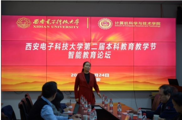 面对一流大学、一流学科、一流专业下“培养一流人才”的新挑战,苗启广教授结合他在专业领域的研究成果和从事教学管理工作的经验与思考,给大家做了“强基固本,智教融合”的专题报告,与参会者共同探讨了如何进一步加强基础理论教育、如何以员工为中心,突出个性化发展,培养员工的创新性思维、如何结合人工智能技术,将智能技术与教师智慧相结合,做到AI+HCI教学相融合,面向产出导向,提升员工培养质量等。论坛报告会结束后,仍有部分教师和苗启广教授一同围绕智能教育话题深度交流。