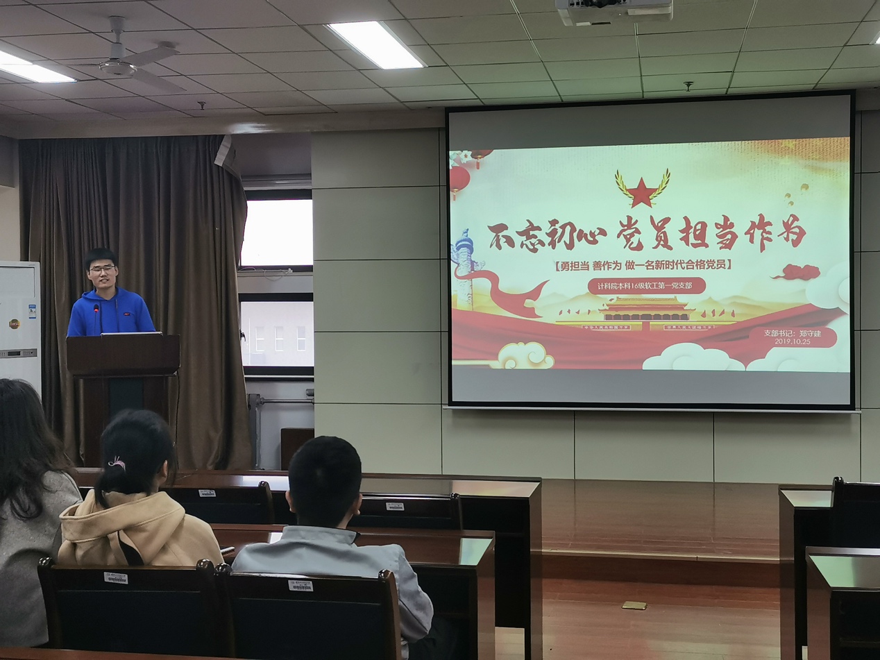 (通讯员 曹佳妮)习近平总书记在十九大报告中指出,要在全党开展 “不忘初心、牢记使命”主题教育活动,用党的创新理论武装头脑,推动全党更加自觉地为实现新时代党的历史使命不懈奋斗。中共中央决定从6月开始,在全党自上而下分两批开展“不忘初心、牢记使命”主题教育活动。10月25日下午五点,体育365官网本科2016级软件工程第一党支部在G楼516开展“不忘初心、牢记使命”主题教育党课活动。活动由支部书记郑守建主持。