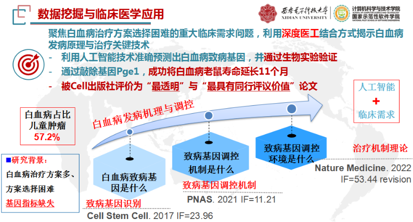 在医疗大数据挖掘与应用方面,马小科教授长期从事医学大数据挖掘与分析,为临床医师的精准诊断、合理治疗方案制订提供帮助。白血病是导致人类死亡的主要疾病之一,研究其发病原理具有重要的意义。通过与美国爱荷华大学医公司进行医工合作,利用数据挖掘与机器学习方法分析白血病患者的深度测序数据,成功发现PGE1基因有效抑制人类骨髓干细胞活性与自动修复功能,为慢性白血病的早期确诊与有效治疗提供了新的思路。同时,进一步利用单细胞测序数据探索白血病恶化组织细胞分化过程的调控关系,证实了Tcf1异质B细胞分化功能。这些研究成果为白血病治疗与诊断提供了理论基础。