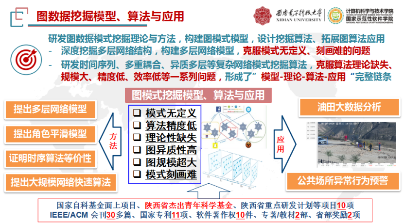 在图数据挖掘方面,图作为一种重要的数据结构,可有效描述事物之间的复杂联系。随着社交网络、Web网等网络中图数据数量不断增加,图数据挖掘技术逐渐成为研究热点。针对图数据挖掘中存在模式定义难、算法理论缺失、模式挖掘效率低、可拓展性弱等问题,马小科教授在模型、算法与应用三个层面进行系统深入研究,证明了时序多层网络演化聚类算法在目标函数上理论等价性,提出了多层网络图模式均衡化指标,设计了一系列多层网络图模式挖掘算法,研发了基于图数据挖掘的油田预警预测系统。