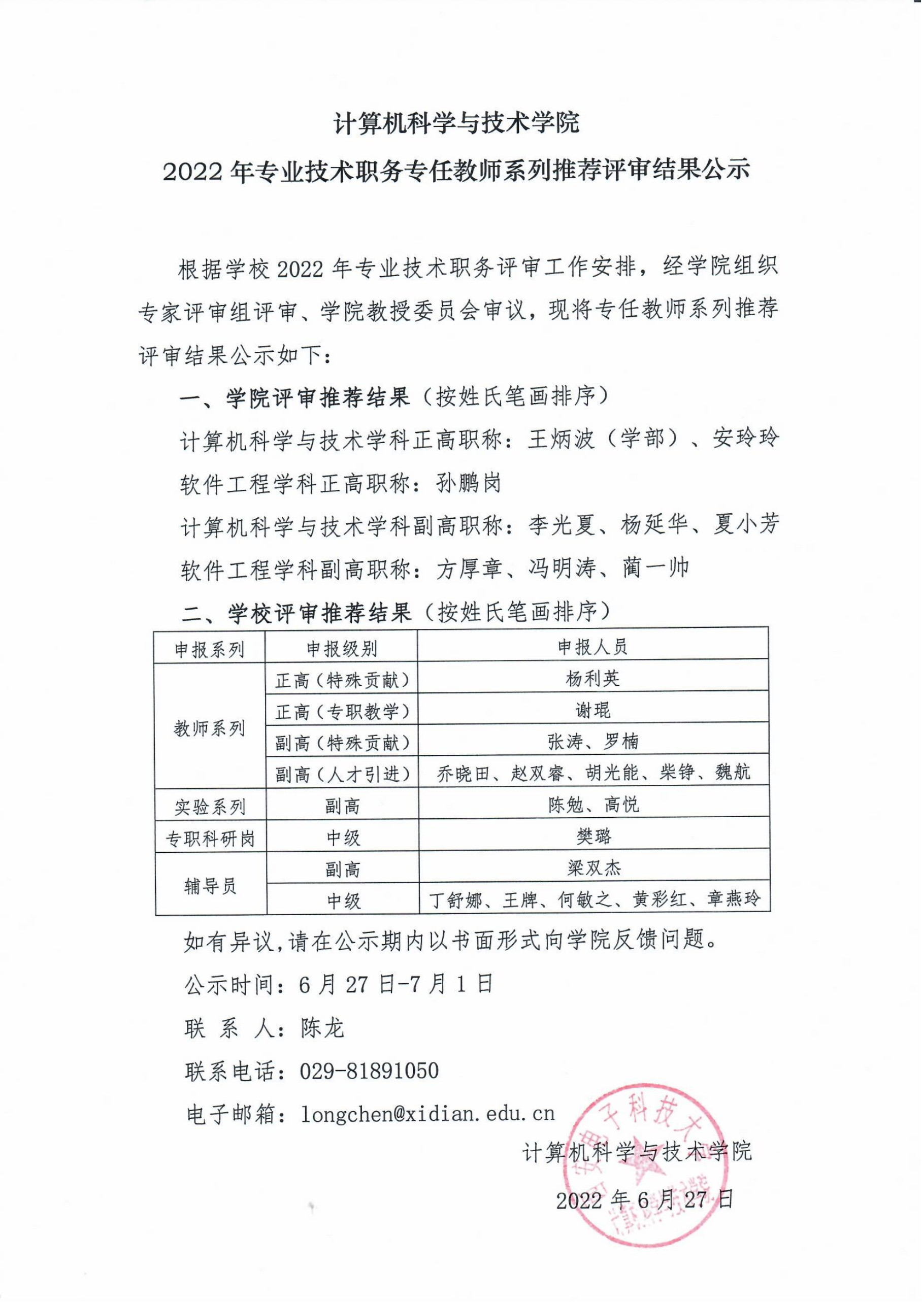 2022年专业技术职务专任教师系列推荐评审结果公示