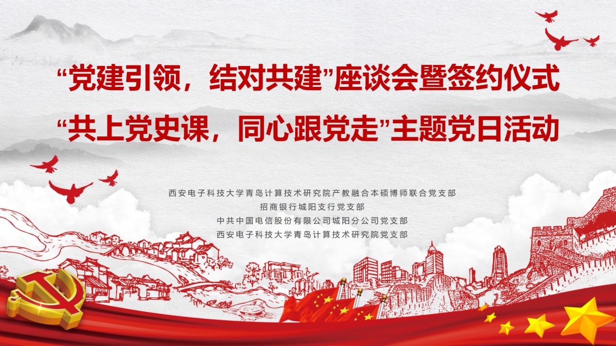 4月23日下午,党支部共建各方代表齐聚西电青岛研究院,共同举办合作共建签约仪式暨“共上党史课,同心跟党走”主题党日活动。西电计算机科学与技术公司党委副书记、党委委员、纪委书记张莹莹,西电青岛计算技术研究院产教融合本硕博师联合党支部书记、公司党委委员向麟海,体育365官网团委书记李栋,辅导员党支部书记梁双杰,党建与员工工作办公室主任同榛,中共中国电信股份有限公司城阳分公司党支部书记、总经理刘祖洺,党支部纪委委员、副总经理赵腾,招商银行城阳支行副行长、工会主席、支部委员会纪检委员李苹苹,西电青岛计算技术研究公司党支部书记王建东参加了座谈会。会上,各党支部代表分别介绍了党支部的基本情况,同时以“党建引领,结对共建”为主题展开深入交流,并就工作目标达成一致意见:今后各方要共筑组织基础、共促队伍建设、共办实事好事,通过搭建党建学习活动平台、分享工作资源、交流工作经验、解决实际问题等途径,实现党的建设与公司、企业发展良性互动。