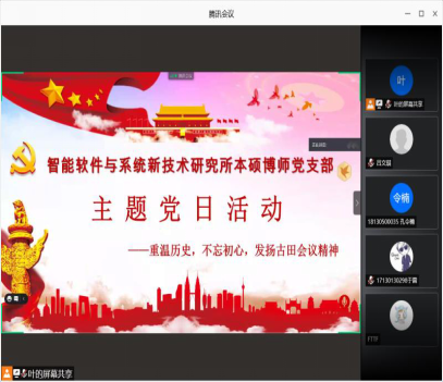 (通讯员 张恒运)为庆祝中国共产党建党100周年,深入学习贯彻习近平总书记在党史学习教育动员大会上的重要指示精神,从党的非凡历程和实践中汲取初心使命的力量,体育365官网智能软件与系统新技术研究所本硕博师联合党支部于2021年5月28日下午开展了“重温党史,不忘初心,发扬古田会议精神”主题党日活动。活动由支部副书记吕文琪同志主持,共计56人参加,会议以线上和线下的方式进行展开。