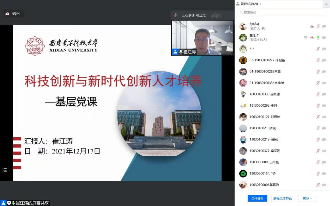 (通讯员 彭延国 尹雪妍)2021年12月17日下午,公司执行经理崔江涛教授为智能媒体与数据工程研究所本硕博师第一、第二和第三联合党支部师生讲授《科技创新与新时代创新人才培养》专题党课。活动由第一联合党支部彭延国主持,联合支部全体党员、积极分子和研究所200余位研究生同学参加。