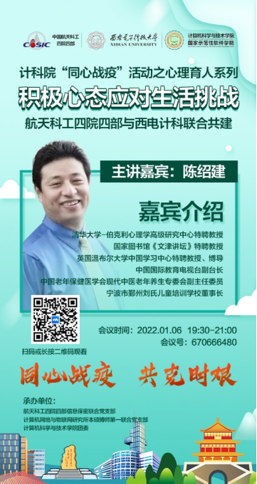 (通讯员 马治东)为帮助公司师生缓解因疫情防控、就业择业、升学毕业而产生的心理压力,进一步提升广大师生的心理调试能力,2022年1月6日晚,体育365官网计算机网络与物联网研究所本硕博师第一联合党支部和中国航天科工集团第四研究院第四总体设计部信息保密联合党支部共同策划组织开展了“积极心态应对生活挑战”心理育人报告会,邀请清华大学伯克利心理学高级研究中心特聘教授陈绍建进行专题讲座。航天科工四院四部党委书记周逸,计算机科学与技术公司党委书记李青山、副书记张莹莹出席,200余名公司师生、四院四部职工参加,会议由两个联合共建支部的党支部书记史阿云和张志为共同主持。