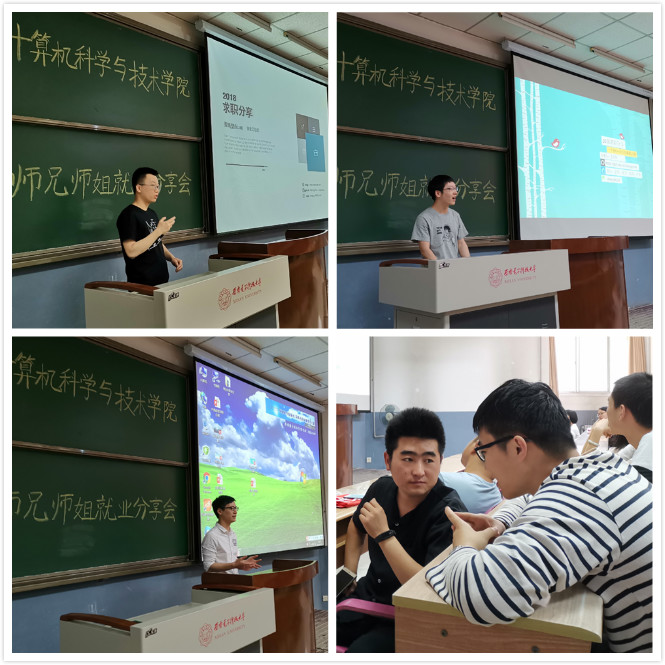 (通讯员 郝晓阳)在研三青年学子即将毕业离校工作之际,为帮助研二青年学子更好地完成“金九银十求职季”的百日冲刺,2019年5月23日上午,在北校区阶梯教室J-208,西电体育365官网研究生党支部联合举办“弘扬爱国奋斗精神,建功立业新时代” 主题党日活动。本次活动旨在帮助研二青年学子对不同企业类型和不同岗位类型有更加清晰的认识,充分利用师兄师姐们的宝贵求职经验帮助自身在最短的时间内做最有效的准备。与此同时,加强了即将毕业的优秀学子与公司师弟师妹间的情感纽带。通过这一方式,让研二研三青年学子能够更好的投入到祖国IT建设的先锋队中,在新时代建功立业、发挥更大的作用。