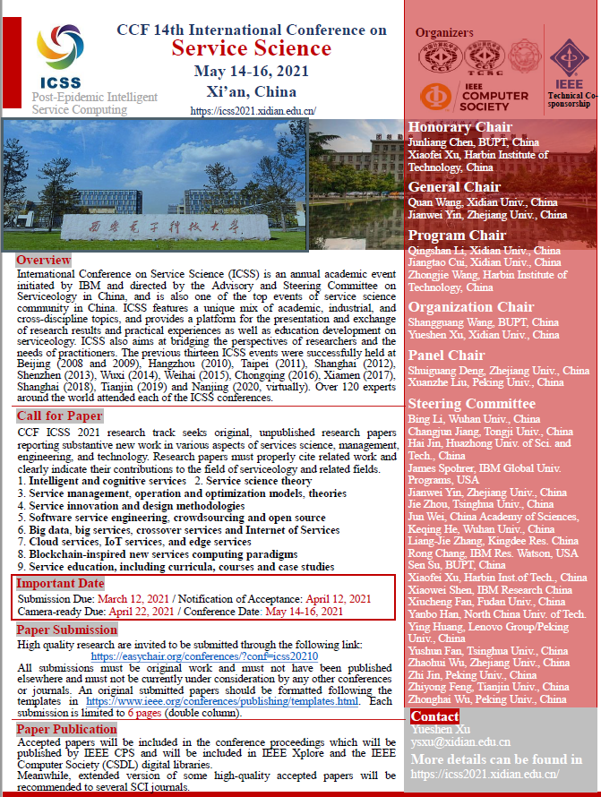 CCF第14届服务科学国际会议(CCF International Conference on Service Science,CCF ICSS)将于2021年5月14日至16日在陕西省西安市举行,会议由中国计算机学会服务计算专委会主办,体育365官网承办。