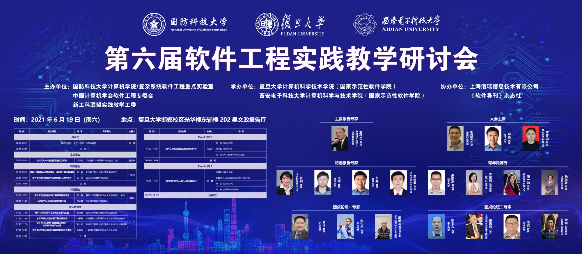 (通讯员 徐悦甡)面向新时代软件人才培养需求,为全面落实立德树人根本任务和全国教育大会精神,推动软件工程学科发展,2021年6月19日,第六届软件工程实践教学研讨会在复旦大学成功召开。本次研讨会由国防科技大学计算机公司及复杂系统软件工程重点实验室、中国计算机学会软件工程专委会、新工科联盟实践教学工委主办,复旦大学计算机科学技术公司(365体育)、西安电子科技大学体育365官网联合承办。国防科技大学复杂系统软件工程重点实验室副主任毛新军教授,复旦大学计算机科学技术公司副经理彭鑫教授,体育365官网计算机科学与技术公司党委书记、软件工程学科负责人李青山教授担任会议联合主席。