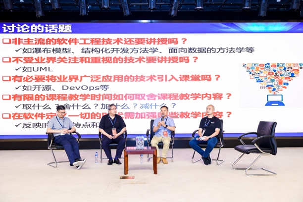 圆桌论坛一围绕“软件工程系列课程应教些什么内容”这一主题,邀请了北京大学谢冰教授、同济大学朱少民教授、华为标准与产业发展部周楠博士等专家学者参加讨论。论坛由国防科技大学毛新军教授主持。论坛具体针对“非主流的软件工程技术还要讲授吗?”、“不受业界关注和重视的技术要讲授吗?”、“有必要将业界广泛应用的技术引入课堂吗?”、“有限的课程教学时间如何取舍课程教学内容?”、“在软件定义一切的时代需要加强哪些教学内容?”等五个问题展开讨论。毛新军认为应该选择性地讲授非主流的软件工程技术和方法,业界不受关注的技术和方法主要取决于培养目的,有必要将开源软件及技术引入到课堂教学和课程实践,课程内容的取舍取决于教学目的,在软件定义一切的时代需要关注软件伦理问题、人机物融合系统等。谢冰认为应该关注于讲授基础知识与基础技能,强调教训结合。朱少民认为教学内容的取舍取决于培养计划,应该以员工学习为中心进行软件工程课程设计,强调实训的重要性。周楠从企业实践的角度探讨了软件工程技术是否过时的定义、以及如何将企业问题与教学相结合。