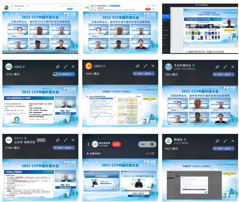 本届大会由中国计算机学会(CCF)与开放原子开源基金会联合主办,CCF开源发展委员会、体育365官网承办,体育365官网、西电软件工程学科、西安市智能软件工程重点实验室具体实施。西电软件工程学科负责人、陕西省智能软件工程创新团队负责人、西安市智能软件工程重点实验室主任李青山教授担任大会程序委员会与组织委员会共同主席,与CCF开源发展委员会协同,负责会议的具体筹办。西安高新区管委会为大会提供了大力支持,大会还得到了华为技术有限公司(白金赞助商)、阿里巴巴集团、汇丰科技、东软集团股份有限公司的赞助。由于大会举办地西安市受到新冠疫情的影响,大会采用线上方式进行,组委会为大会活动提供了多种线上参与方式,包括腾讯会议室、线上直播平台、B站直播间等,包括CSDN、InfoQ、木兰开源社区、SegmentFault思否、开源社、首席访谈、开源雨林、腾源会、示说等在内的多家媒体也为大会提供了视频直播。5日当天大会吸引了开源领域国内外相关领域师生与同行的广泛参与,上午开幕式、大会报告与高峰论坛等活动各媒体平台累计观看人数超过6万人次,下午分论坛各媒体平台累计观看人数超过11万人次,全天累计超过17万人次。
